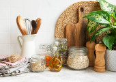 Zdjęcie "Przybory kuchenne, narzędzia i naczynia na tle białej ściany płytek. Wnętrze, nowoczesna kuchnia w jasnych kolorach. Puste miejsce na tekst, widok z przodu" może być wykorzystywane do celów osobistych i komercyjnych zgodnie z warunkami zakupionej licencji Royalty-free. Obraz jest dostępny do pobrania w jakości wysokiej rozdzielczości do 5760x3840.