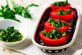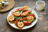 Umieścić opatrunek na pomidorach. Podawać przystawkę do stołu, które wcześniej nalegał na zimno przez 20-30 minut.