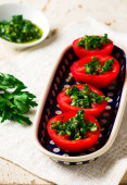 Zdjęcie "Umieścić opatrunek na pomidorach. Podawać przystawkę do stołu, które wcześniej nalegał na zimno przez 20-30 minut." może być wykorzystywane do celów osobistych i komercyjnych zgodnie z warunkami zakupionej licencji Royalty-free. Obraz jest dostępny do pobrania w jakości wysokiej rozdzielczości do 5760x3840.