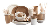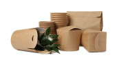 Zestaw jednorazowych ekologicznych naczyń i jabłek na białym tle