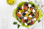 Tradycyjna grecka sałatka ze świeżego ogórka, pomidora, słodkiej papryki, sałaty, czerwonej cebuli, sera feta i oliwek z oliwą z oliwek na białym talerzu. Zdrowe jedzenie, widok z góry.
