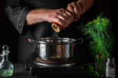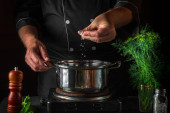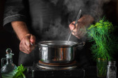 Zdjęcie "Szef kuchni dodaje oleju do rondla podczas robienia pierogów. Środowisko pracy na stole kuchnia vintage w restauracji" może być wykorzystywane do celów osobistych i komercyjnych zgodnie z warunkami zakupionej licencji Royalty-free. Obraz jest dostępny do pobrania w jakości wysokiej rozdzielczości do 5760x3840.