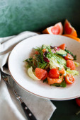 Talerz ze smaczną sałatką grejpfrutową na ciemnym tle