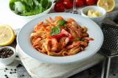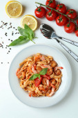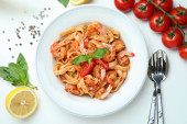 Koncepcja gotowania makaron krewetki na białym drewnianym stole