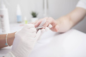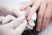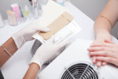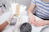 Przycięte z bliska manikiurzysta pilnowanie paznokcie klienta