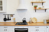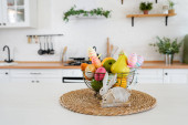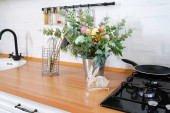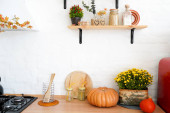 kolorowa jesienna martwa natura na stole kuchennym w domu. Dynie, bukiet kwiatów i spadające liście