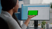 Przedsiębiorca patrząc na smartfon z zielonym ekranem