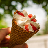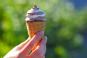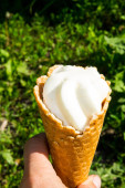 Stożek waflowy z lodami w dłoni mężczyzny w parku w słoneczny dzień. Wysokiej jakości zdjęcie