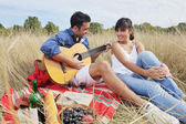 szczęśliwy młody para korzystających piknik na wsi w terenie i mają dobry czas