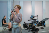 Dyrektor w pracy na planie. Reżyser pracuje z grupą lub odtwarzaczem podczas kręcenia filmu, reklamy lub serialu telewizyjnego. Strzelanina, sprzęt i grupa. Nowoczesna technika fotografii.