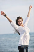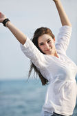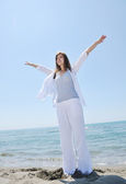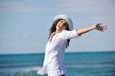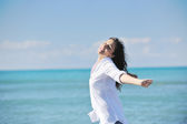 szczęśliwa para młodych w białych ubrań mają romantyczny wypoczynek i zabawa na plaży na wakacje