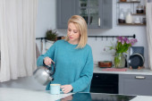Zdjęcie "blondynka wlewa kawę do filiżanki z dzbanka" może być wykorzystywane do celów osobistych i komercyjnych zgodnie z warunkami zakupionej licencji Royalty-free. Obraz jest dostępny do pobrania w jakości wysokiej rozdzielczości do 5760x3840.
