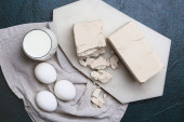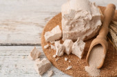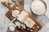 Deska drewniana ze świeżymi i suchymi drożdżami na podłożu grunge