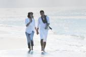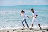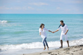 szczęśliwa para młodych w białych ubrań mają romantyczny wypoczynek i zabawa na plaży na wakacje