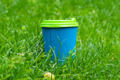 Kubek z papieru kawowego na drewnianej ławce w letnim parku w pochmurny dzień, miejsce do kopiowania. Koncepcja rekreacji parku.