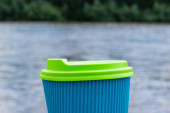Papierowa torba z jedzeniem na wynos i szklanki z kawą na ławce w parku. Pojęcie dostarczania żywności, komunikacja podczas kwarantanny covid 19.