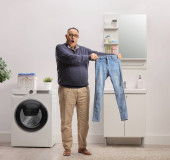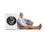 Dojrzały mężczyzna opierając się na pralce z butelką żelu do prania i wskazując izolowane na białym tle