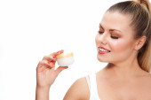 młody kaukaski kobieta co dekoracje Wielkanocne, na białym tle