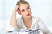 wyczerpany, kobiece, wypełniania formularzy podatkowych siedząc przy biurku. na białym tle