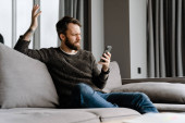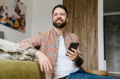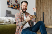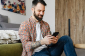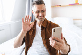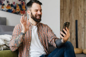 Zdjęcie "Uśmiechnięta brunetka brodaty mężczyzna na wideo rozmowy przez telefon komórkowy podczas siedzenia na podłodze w domu, machając ręką" może być wykorzystywane do celów osobistych i komercyjnych zgodnie z warunkami zakupionej licencji Royalty-free. Obraz jest dostępny do pobrania w jakości wysokiej rozdzielczości do 5760x3840.