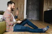 Uśmiechnięta brunetka brodaty mężczyzna na wideo rozmowy przez telefon komórkowy podczas siedzenia na podłodze w domu, machając ręką
