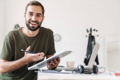 Happy brnuette w średnim wieku brodaty mężczyzna pracuje z dokumentami, zauważając siedząc przy stole w pomieszczeniach, jedząc śniadanie