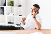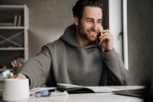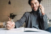 Uśmiechnięta brunetka w średnim wieku, trzymająca telefon komórkowy, pracująca z dokumentami, siedząca przy stole, dzwoniąca