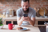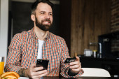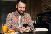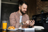 Uśmiechnięta brunetka w średnim wieku trzymająca telefon komórkowy, pracująca z dokumentami siedząc przy stole w domu