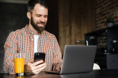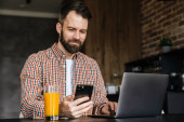 Zdjęcie "Uśmiechnięta brunetka w średnim wieku trzymająca telefon komórkowy, pracująca z dokumentami siedząc przy stole w domu" może być wykorzystywane do celów osobistych i komercyjnych zgodnie z warunkami zakupionej licencji Royalty-free. Obraz jest dostępny do pobrania w jakości wysokiej rozdzielczości do 5760x3840.