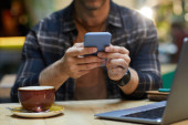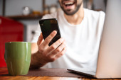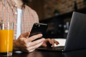 Zdjęcie "Przycięty obraz brunetki w średnim wieku, brodatego mężczyzny siedzącego przy stole, patrzącego na laptopa, trzymającego telefon komórkowy w domu." może być wykorzystywane do celów osobistych i komercyjnych zgodnie z warunkami zakupionej licencji Royalty-free. Obraz jest dostępny do pobrania w jakości wysokiej rozdzielczości do 5760x3840.