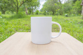 biały kubek z niebieskim niebem i białymi chmurami w tle. biały kubek makieta z naturalnym krajobrazem