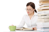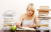 młoda kobieta siedząca za książki