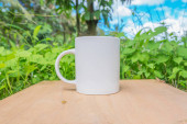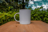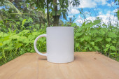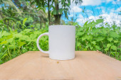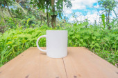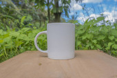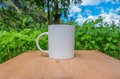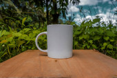 biały kubek z niebieskim niebem i białymi chmurami w tle. biały kubek makieta z naturalnym krajobrazem