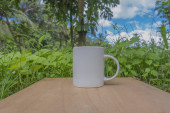 biały kubek z niebieskim niebem i białymi chmurami w tle. biały kubek makieta z naturalnym krajobrazem