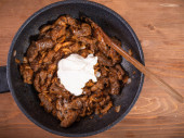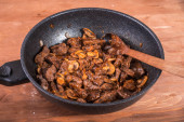 Gotowanie stroganoff wołowiny - smażone kawałki wołowiny na patelni, pierwszy krok w produkcji stroganoff wołowiny