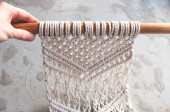 Zdjęcie "Mural ścienny Boho wykonany z naturalnych nici bawełnianych przy użyciu techniki makramy do dekoracji wnętrz i ślubów w procesie produkcji" może być wykorzystywane do celów osobistych i komercyjnych zgodnie z warunkami zakupionej licencji Royalty-free. Obraz jest dostępny do pobrania w jakości wysokiej rozdzielczości do 5760x3840.
