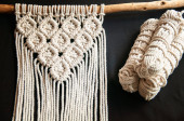 Zdjęcie "Mural ścienny Boho wykonany z naturalnych nici bawełnianych przy użyciu techniki makramy do dekoracji wnętrz i ślubów" może być wykorzystywane do celów osobistych i komercyjnych zgodnie z warunkami zakupionej licencji Royalty-free. Obraz jest dostępny do pobrania w jakości wysokiej rozdzielczości do 5760x3840.