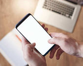 Mock up pusty ekran mobilny trzymając 2 ręce na drewnianym biurku z materiałów biurowych