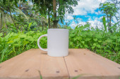 biały kubek z niebieskim niebem i białymi chmurami w tle. biały kubek makieta z naturalnym krajobrazem