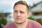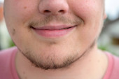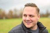 Uśmiechnięty młody człowiek z krótką brodą, uśmiechnięty szczęśliwie do kamery w zbliżeniu na zewnątrz portret