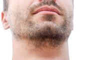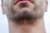 Nieogolony młody człowiek z wiotką brodą z bliska na gardle i włosami na twarzy na zewnątrz przeciwko szaremu niebu