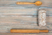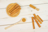 Zestaw drewnianych naczyń kuchennych na białym tle. Widok góry. Kopiuj miejsce na tekst