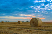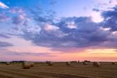 Zachód słońca nad polem uprawnym z belami siana