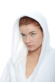 piękna młoda kaukaski kobieta w szlafrok po kąpieli spokojny portret.