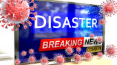 Degradacja i klęska żywiołowa podczas pandemii żywiołowej, wyobrażana jako malejąca katastrofa falna fraz i wirus korony symbolizujący obecne problemy spowodowane epidemią, ilustracja 3D