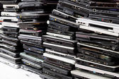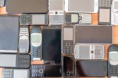 Tło uszkodzonych telefonów komórkowych. Banda zepsutych smartfonów. Używane telefony ułożone jeden na drugim. Usługi naprawy i konserwacji sprzętu.
