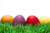 Pisanki i kurczęta na zielonej trawie na białym, izolowanym tle
