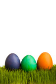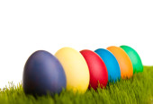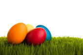 Pisanki i kurczęta na zielonej trawie na białym, izolowanym tle