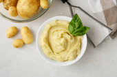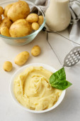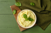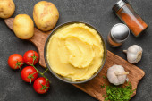 Zdjęcie "Skład ze smacznymi tłuczonymi ziemniakami na drewnianym tle" może być wykorzystywane do celów osobistych i komercyjnych zgodnie z warunkami zakupionej licencji Royalty-free. Obraz jest dostępny do pobrania w jakości wysokiej rozdzielczości do 5760x3840.