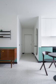 Minimalistyczny design w jasnej kuchni z biało-zielonymi szafkami i lazurowymi płytkami podłogowymi